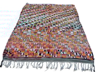 This captivating vintage Talsint rug unravels like a labyrinth, inviting the eye to linger and discover. Its entire field is woven with miniature lattice motifs, each varying in scale and form, punctuated rhythmically by horizontal lines that seem to guide the narrative. At first glance, the composition appears abstract, but with time, hidden chevron shapes begin to emerge, cleverly concealed within the intricate geometry.