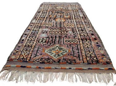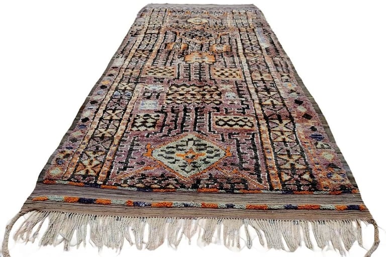 An extraordinary vintage rug from the eastern High Atlas, this Talsint piece reads like a sacred manuscript woven in wool. With a palette that echoes timeworn frescoes, smoky lavender, earthy rose, and muted mauve form the softened ground, each knot seems to carry the hush of memory. Punctuated by bold strokes of mustard yellow, burnt orange, and deep black, the composition builds in contrast and rhythm, while tones of dusty green, soft grey, and ivory add quiet complexity.