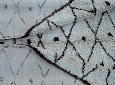The composition is defined by a continuous diamond trellis, each lozenge softly enlivened with dotted details. Woven in natural wool, the contrast between the warm ivory field and the deep black-brown lattice creates a design both graphic and timeless. Minimal in colour yet rich in meaning, this rug is a study in restraint and rhythm, a piece where every knot holds symbolic resonance.