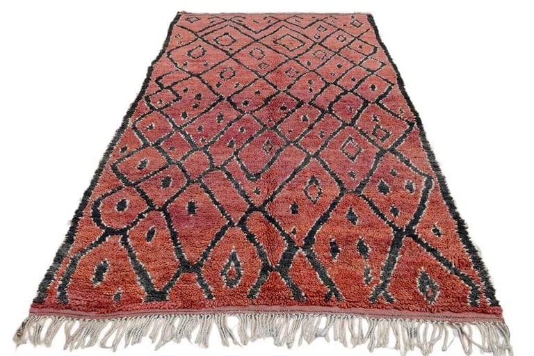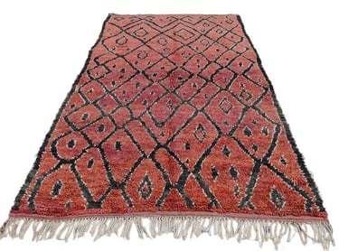 This vintage rug from the Aït Bou Ichaouen tribe features a richly abrashed field in gently faded burnt red, with tonal shifts that occasionally drift into a dark orange glow. A delicate network of lozenges stretches across the surface, each one unique in form and proportion, housing smaller diamond motifs that lend rhythm and fluidity to the composition.