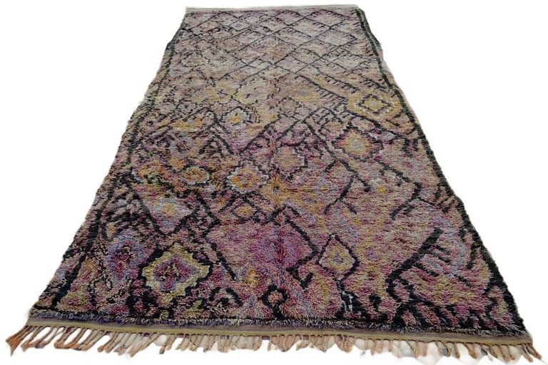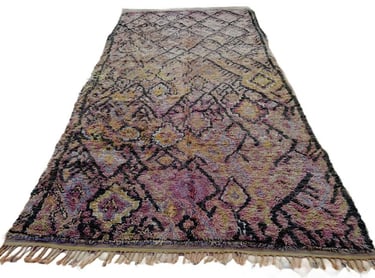 This vintage Aït Bou Ichaouen rug speaks in deep, poetic hues, led by a chorus of purples, soft pinks, and mustard yellow, all boldly outlined in charcoal black. The palette is moody and vibrant in equal measure, with color layering that creates a sense of depth and movement.