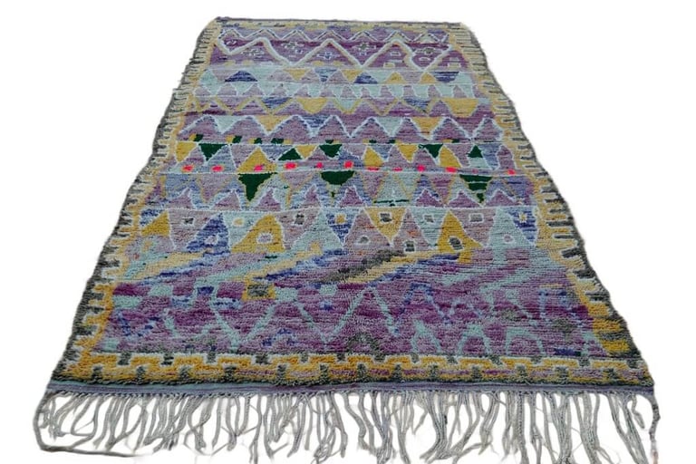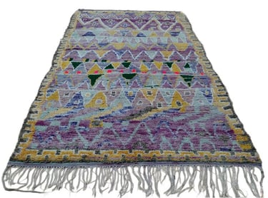 This rare vintage rug from the Aït Bou Ichaouen tribe is a stunning example of Amazigh textile artistry, preserved in exceptional condition. It features a vivid and diverse color palette, purple, magenta, chartreuse yellow, deep forest green, ice blue, and a bold splash of hot pink that draws the eye like a whispered secret within its story.